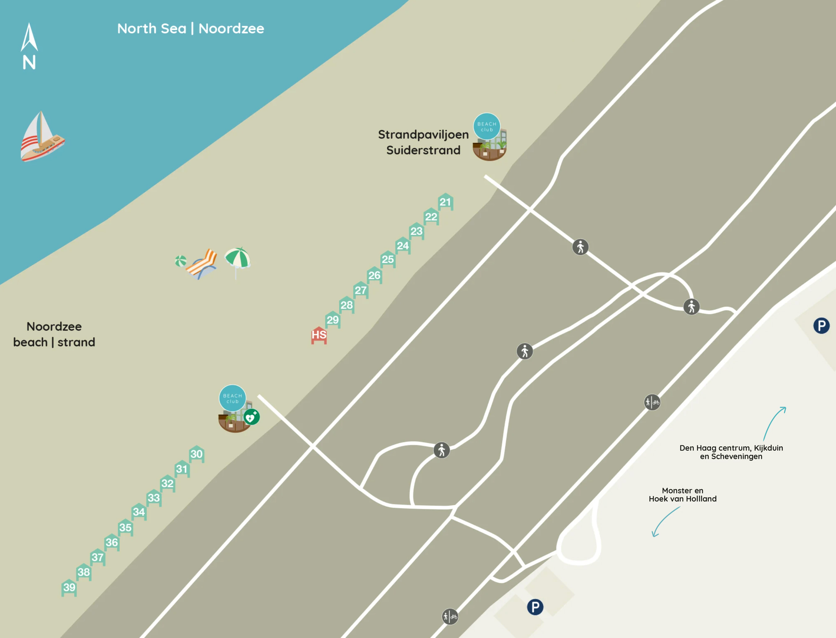 Kijkduin Strandhuisjes (nr. 21 t/m 39) op het Zuiderstrand in Kijkduin.
